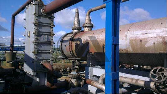 На Рис.2 показана произведенная замена кожухотрубчатого теплообменника, марки 1400 КП-25-52-0/20-22, технологической позиция Т-16/4 (конденсатора пропана технического), на пластинчатый марки Н0,5-153,6-КУ-СП. Площадь нового теплообменника составила 153,6 м2, а площадь замененного составляла 831 м2. Снижение площадей  теплообмена в пластинчатых теплообменниках достигается за счет следующих преимуществ: