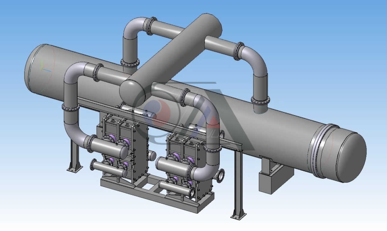 На рис.1 показана замена кожухотрубчатого теплообменника, на пластинчатые теплообменники с разборным корпусом. Обращаем Ваше внимание, что разработанная конструкция, позволила установить новое оборудование без переобвязки существующих трубопроводов.